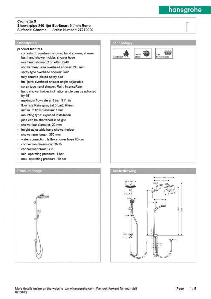 مسطرة دش هانز جروهي كاملة مع طاسة بتصميم وصناعة ألمانية فاخرة تجمع بين الأناقة الكلاسيكية والكروم اللامع، وبالتالي فيأتي هذا المنتج ليجمع بين الطابع الجمالي والوظيفي، حيث تأتي المسطرة برأس دش بقطر 24 سم، ليمنحك إحساس بالمطر لتشعر بالانتعاش، ناهيك على أنه يرفق معه سماعة متعددة الاستخدامات لتختار نوع التدفق سواء خفيف أو مكثف حسب الرغبة، كل هذا يضمن لك تجربة استحمام مرحة وعملية.